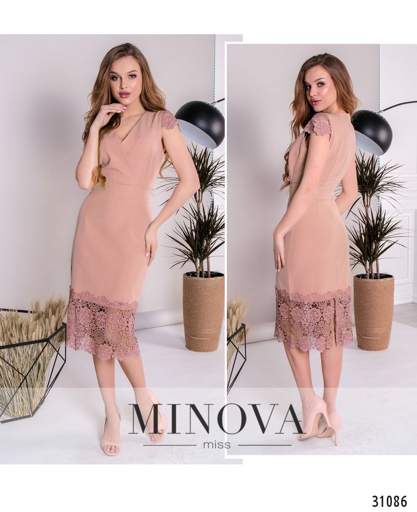 Романтичное платье по фигуре с кружевом «кроше» на рукавах и подоле. Отрезной лиф на запАх скроен с вытачками. Рукава выполнены из кружева. Талия с поясом-вставкой. Подол украшен широкой отрезной кружевной лентой. На спине платье застегивается на скрытую молнию и дополнено разрезом по линии шага.