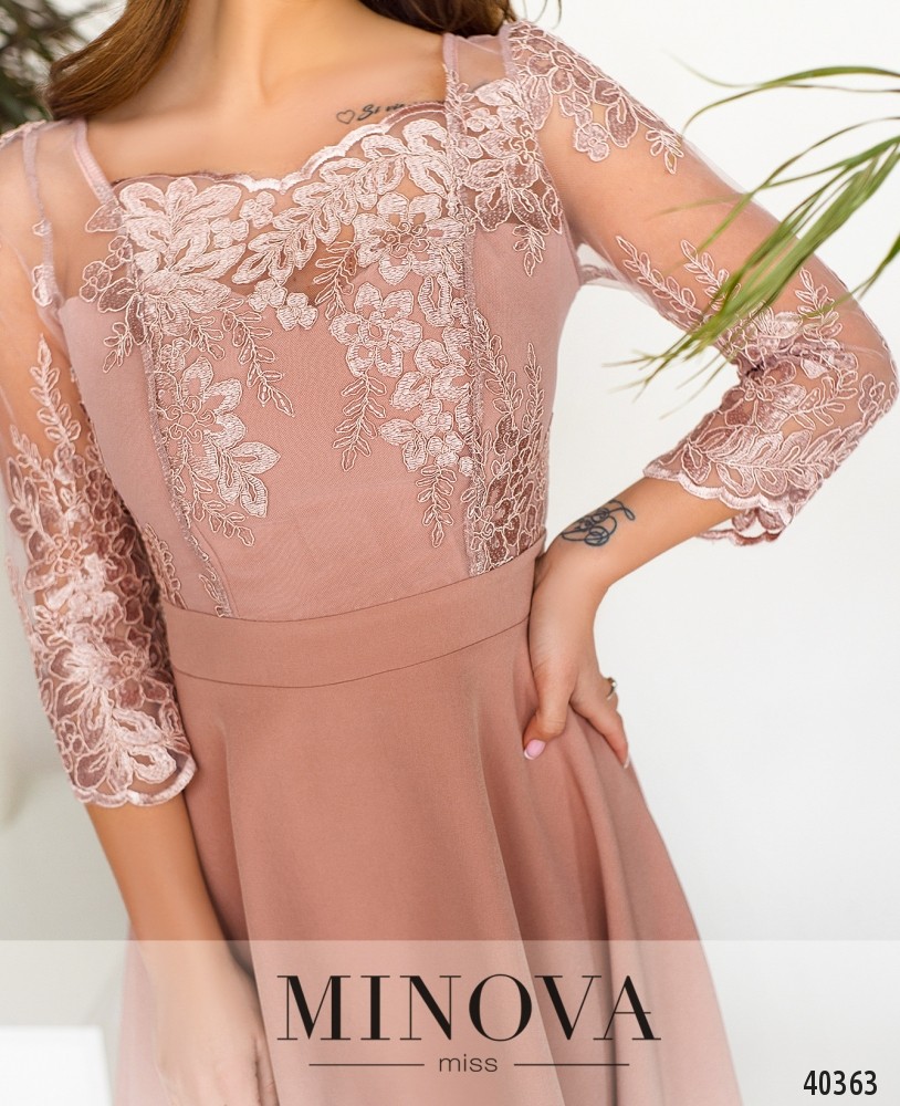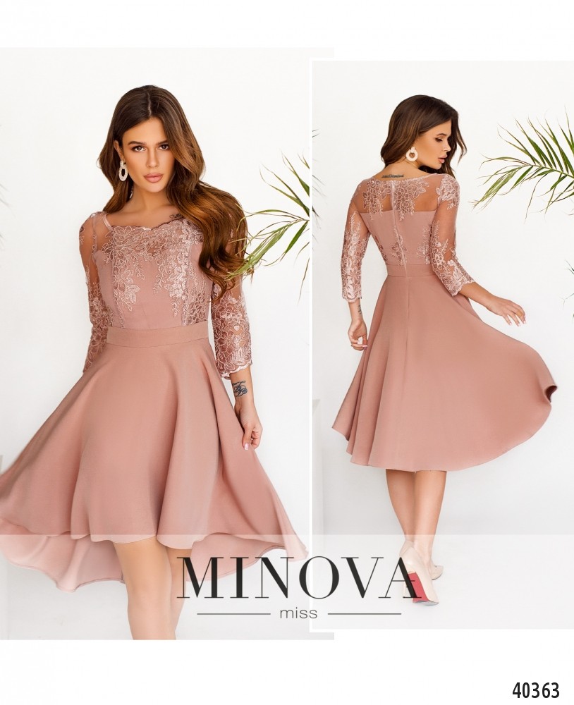 Стильное платье с асимметричным подолом, ниспадающим мягкими оборками. Верх украшен полупрозрачной сеточкой с ажурным узором, снизу - плотная ткань. Рукава без подкладки и без манжет. Платье застёгивается на молнию, вшитую по спинке. На груди вытачки. Силуэт приталенный. Карманов нет. Вырез горловины полукруглый.