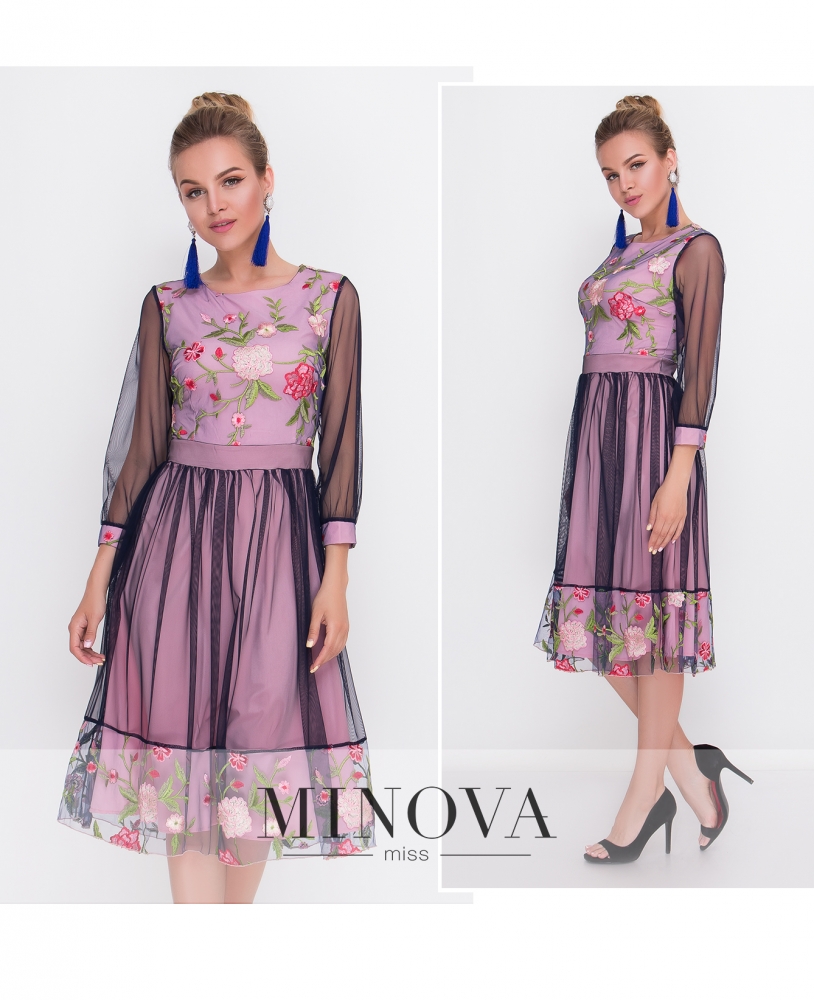 Нарядное платье из черной сетки и нижнего цветного слоя с рукавами-фонариками длиной ¾ и отрезным пышным подолом. Рукава выделены цветными манжетами. Лиф и подол расшиты цветами. На спинке платье застегивается на скрытую молнию.