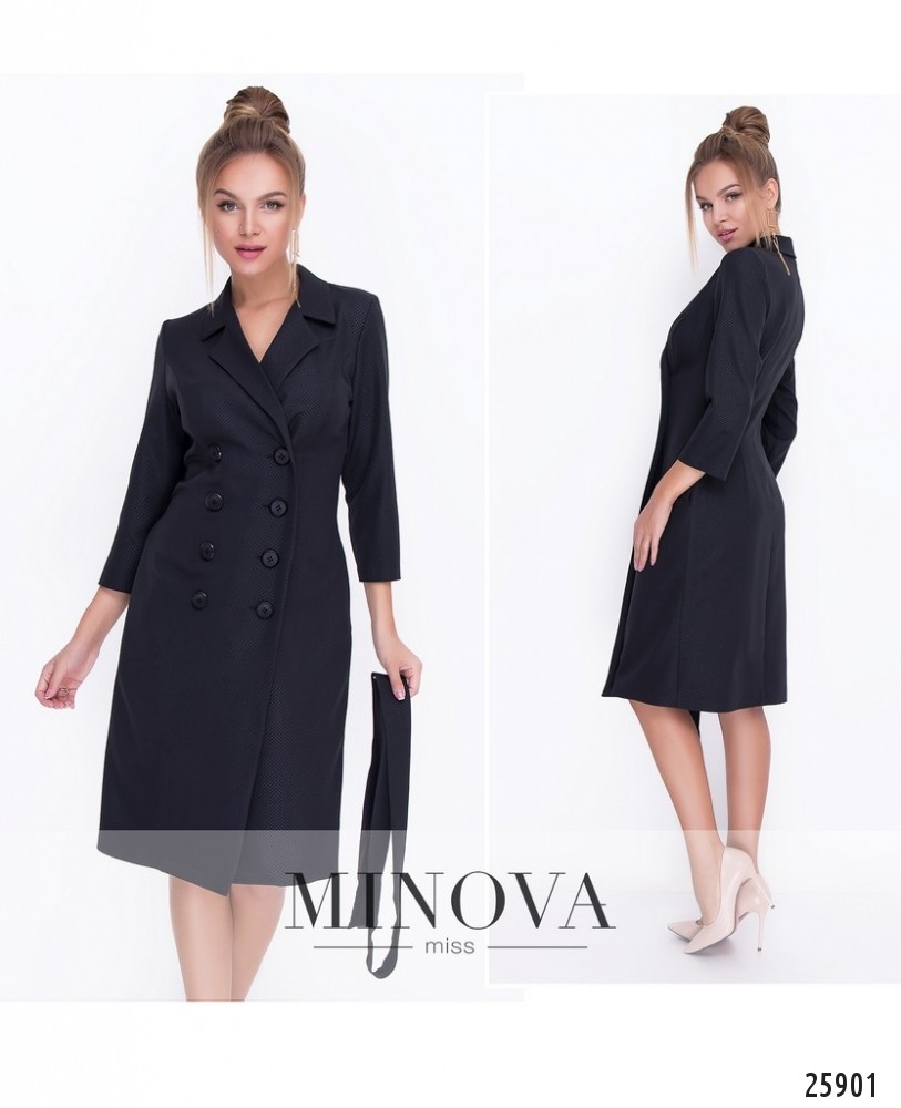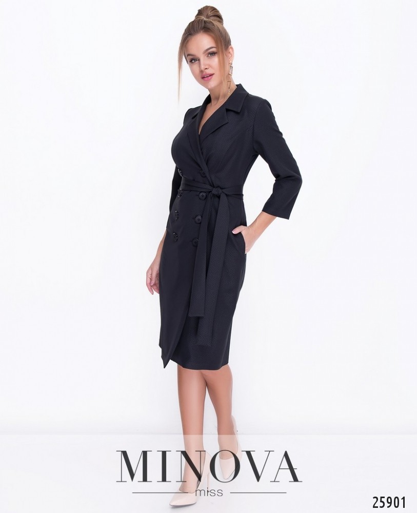 Элегантное двубортное платье-пиджак с поясом. Платье с отложным воротником застегивается на внутреннюю пуговицу и на внешнюю на запах. Платье подчеркивает силуэт. Дополнительно можно выделить талию с помощью пояса в тон. Длина рукава ¾. Платье дополнено карманами.