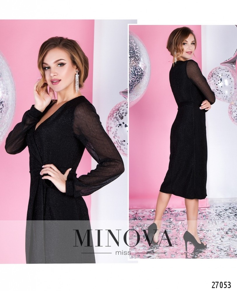 Сногсшибательное платье-миди на запАх из люрекса. Платье повторяет контуры тела, благодаря внутренней петельке и длинному двойному поясу. Пояс завязывается в бант на лицевой стороне. Рукава из полупрозрачной сетки-гофрэ собраны в манжеты. Платье идеально подходит для вечеринок и выходов в свет.