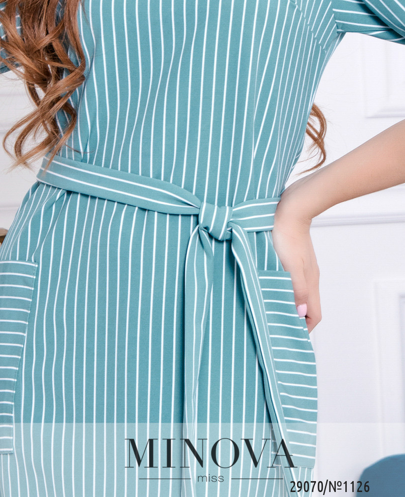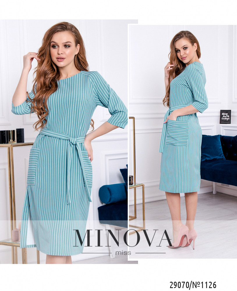Платье в полоску с рукавами ¾ и съемным поясом в тон. Платье прямого кроя украшено накладными карманами по бокам и разрезами вдоль боковых швов. На спине платье застегивается на скрытую молнию.