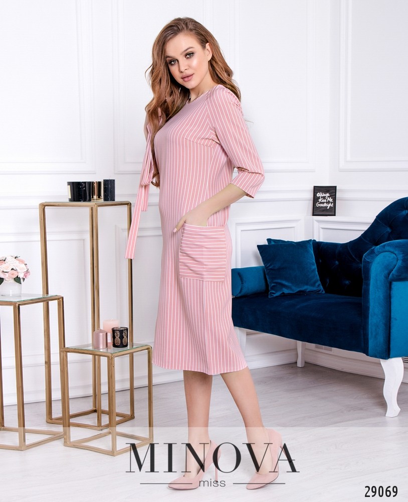 Платье в полоску с рукавами ¾ и съемным поясом в тон. Платье прямого кроя украшено накладными карманами по бокам и разрезами вдоль боковых швов. На спине платье застегивается на скрытую молнию.