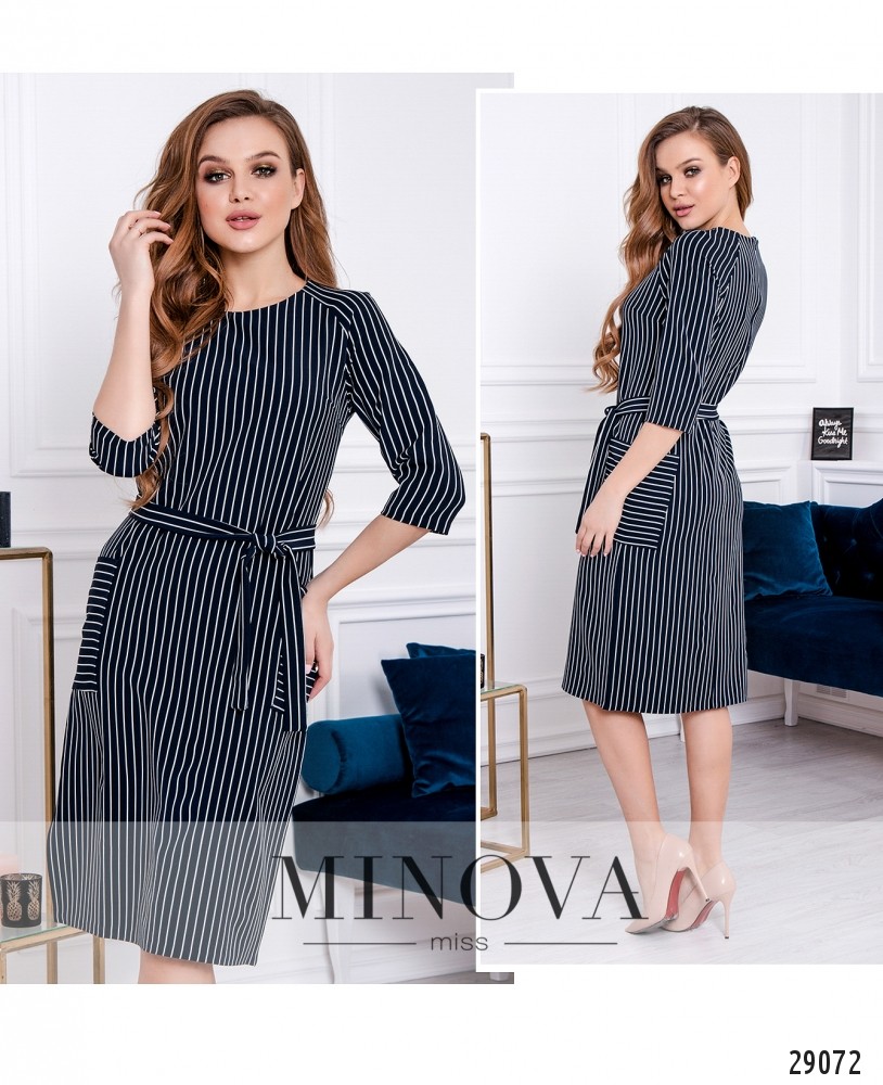 Платье в полоску с рукавами ¾ и съемным поясом в тон. Платье прямого кроя украшено накладными карманами по бокам и разрезами вдоль боковых швов. На спине платье застегивается на скрытую молнию.