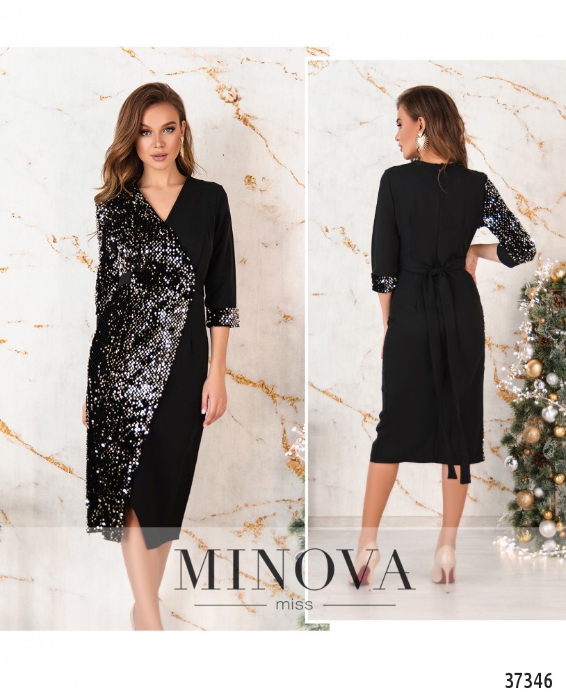 Приталенное нарядное платье. Правая сторона украшена пайетками, рукав декорирован с двух сторон. Левая сторона однотонная. На правом рукаве манжет однотонный, на левом – с пайетками. На талии вшит пояс, который завязывается сзади. Верх и подол подшиты на запАх. Карманов нет. Спинка без декора, с продольными вытачками и вшитой молнией.