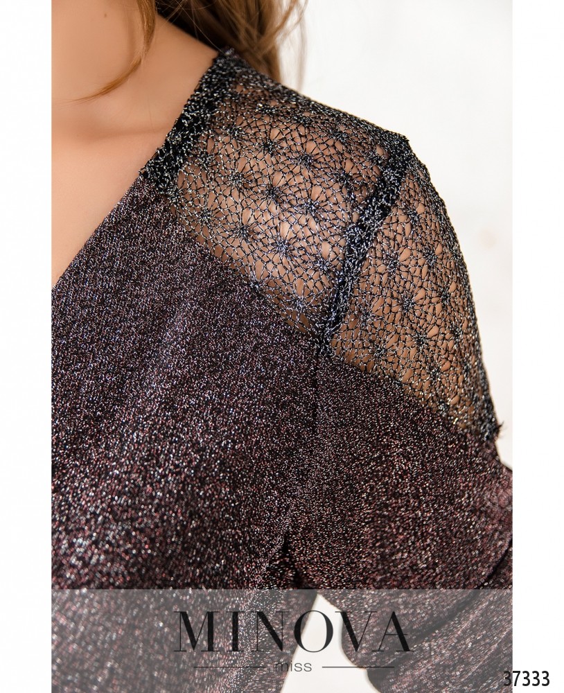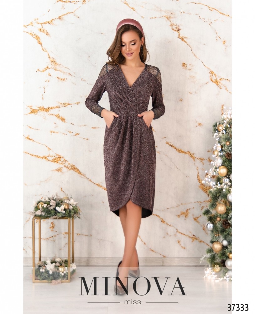 Нарядное приталенное платье с подшитым на запАх верхом и подолом. Ткань мягкая, с люрексом. Плечи и рукава украшены тонким кружевом. По бокам – прорезные карманы. На спине – продольные вытачки, на груди – диагональные. Застёгивается на вшитую по спинке змейку.