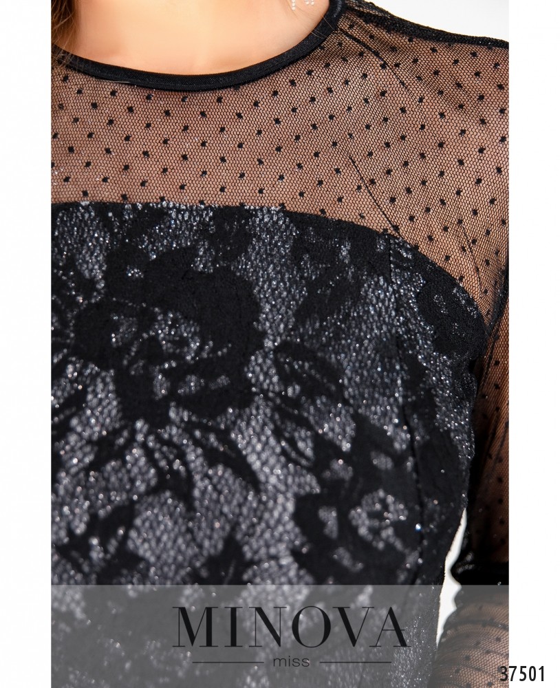 Приталенное платье из ткани с люрексом, украшенное блёстками. Сверху – сеточка с мелкими декоративными элементами, на основной части – цветочные узоры. Рукава без подкладки и без манжет. Застёгивается на вшитую по спинке змейку. Сзади на подоле небольшая шлица.