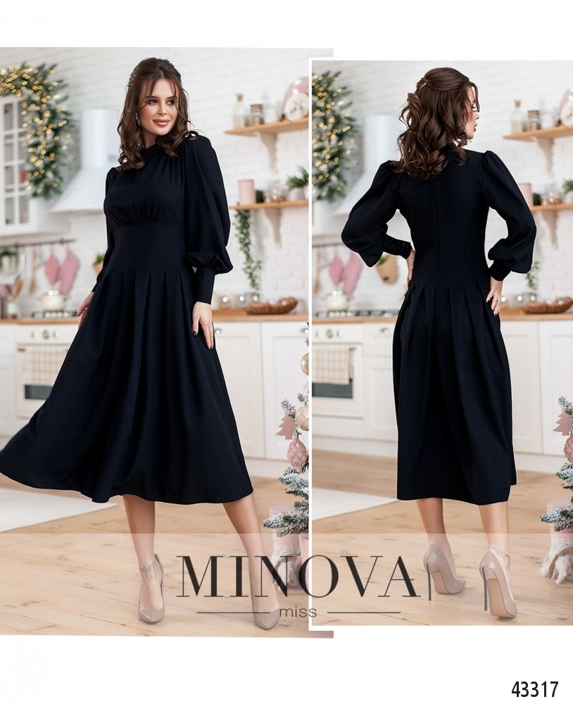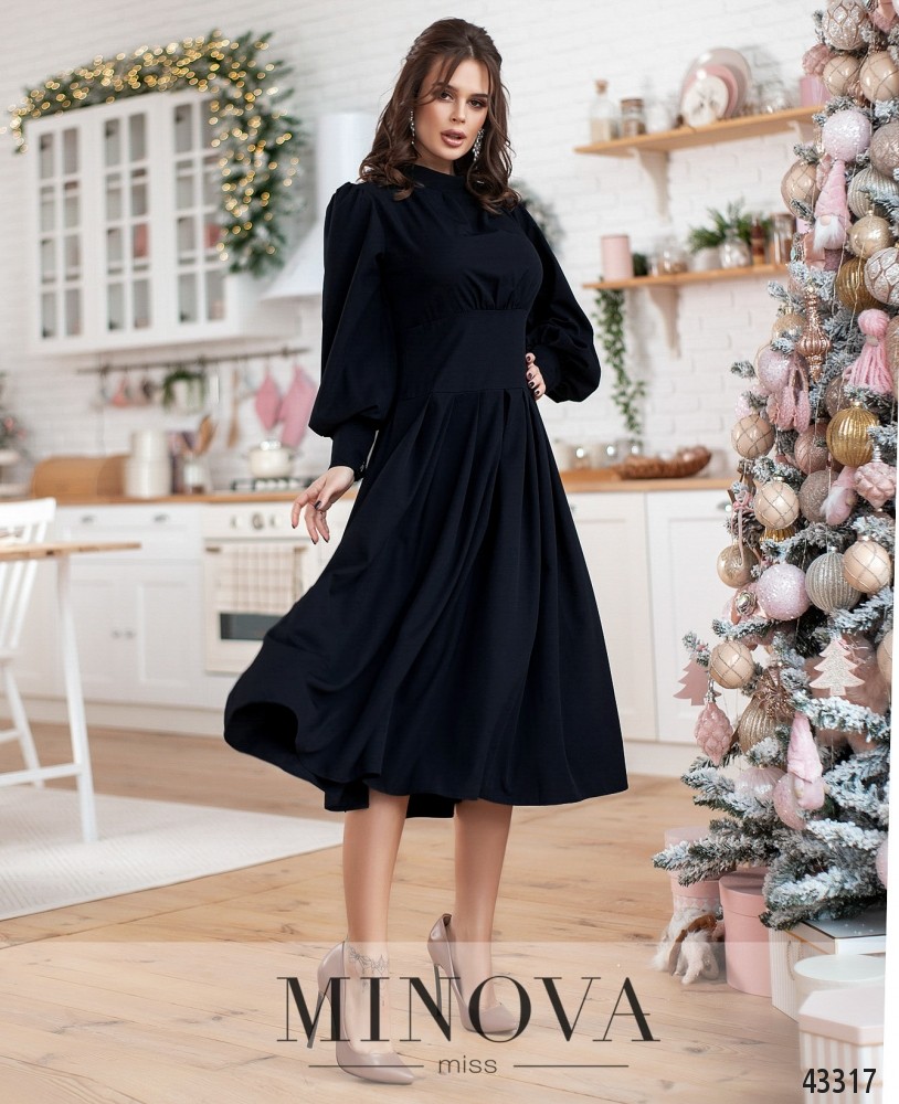 Минималистичное платье с воротником-стоечкой, подол присобран, отделён от лифа "пояском". Лиф также с вытачками на талии. Карманов нет. Рукава с длинными манжетами, на манжетах по три пуговицы. Застёжка - вшитая по спинке молния.