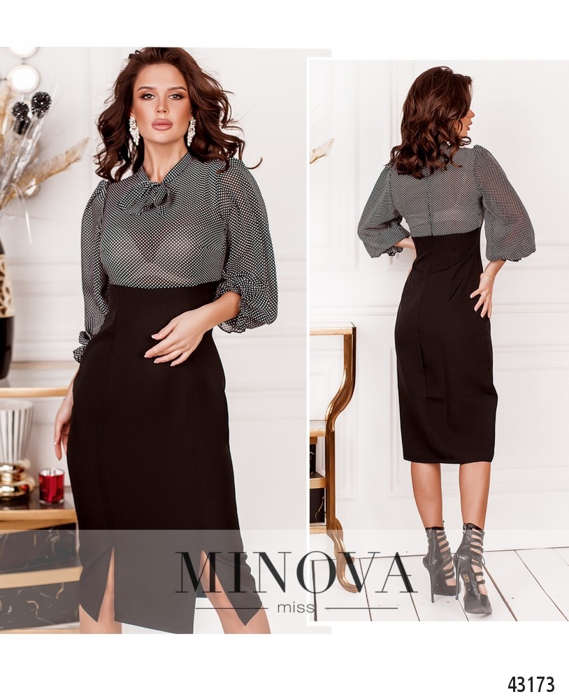 Минималистичное элегантное платье с полупрозрачным верхом и плотным низом. На горловине - ленты, завязываются на бант. Рукава с манжетами-оборками и вшитыми резинками. На подоле спереди две шлицы. Силуэт приталенный. Застёжка - вшитая по спинке молния. Карманов нет. На груди вытачки.