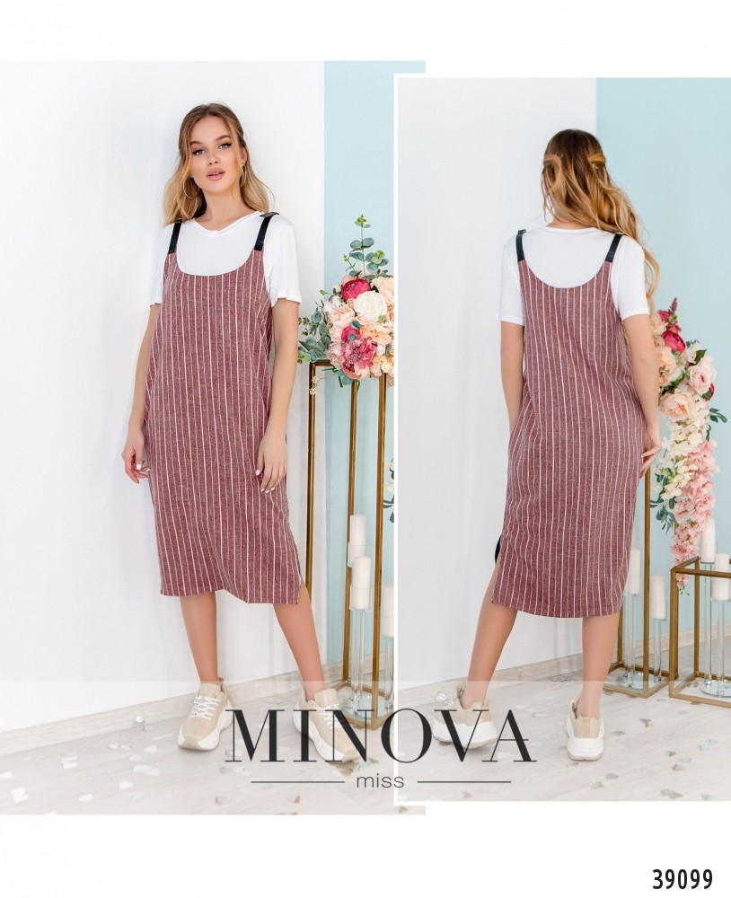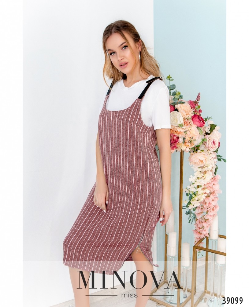 Стильный сарафан без застёжек, с тонкими лямками, которые можно регулировать по длине. По бокам - врезные карманы, принт в тонкую полоску.