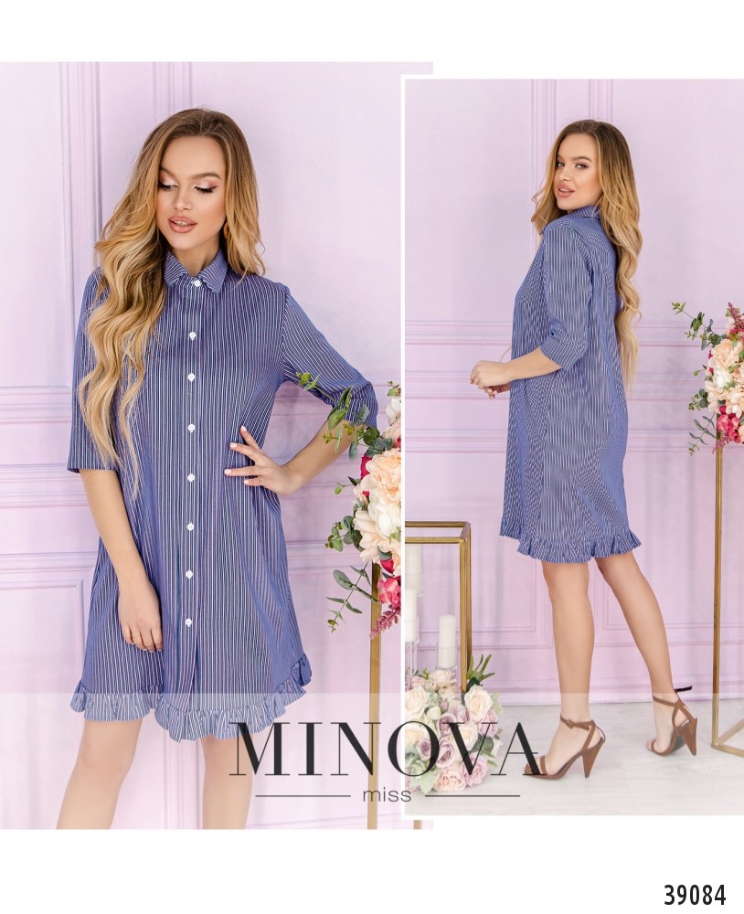 Лёгкое повседневное платье в тонкую полоску, без карманов, застёгивается на пуговицы, расположенные спереди на планке. Воротничок отложной.