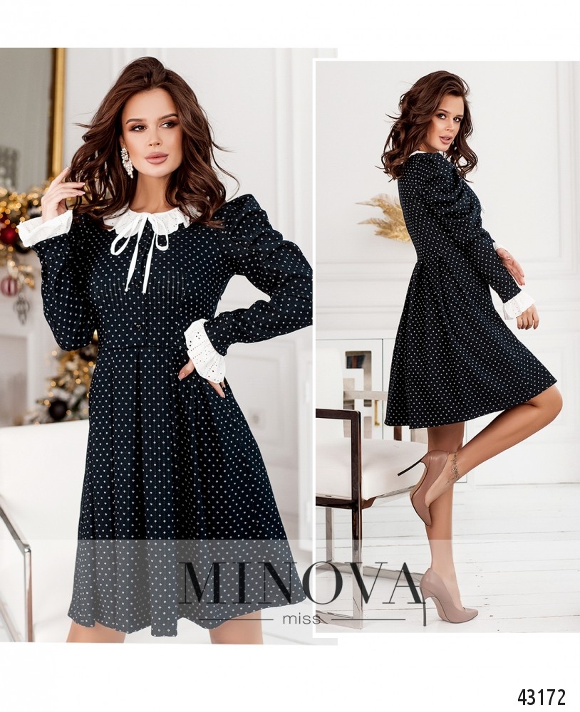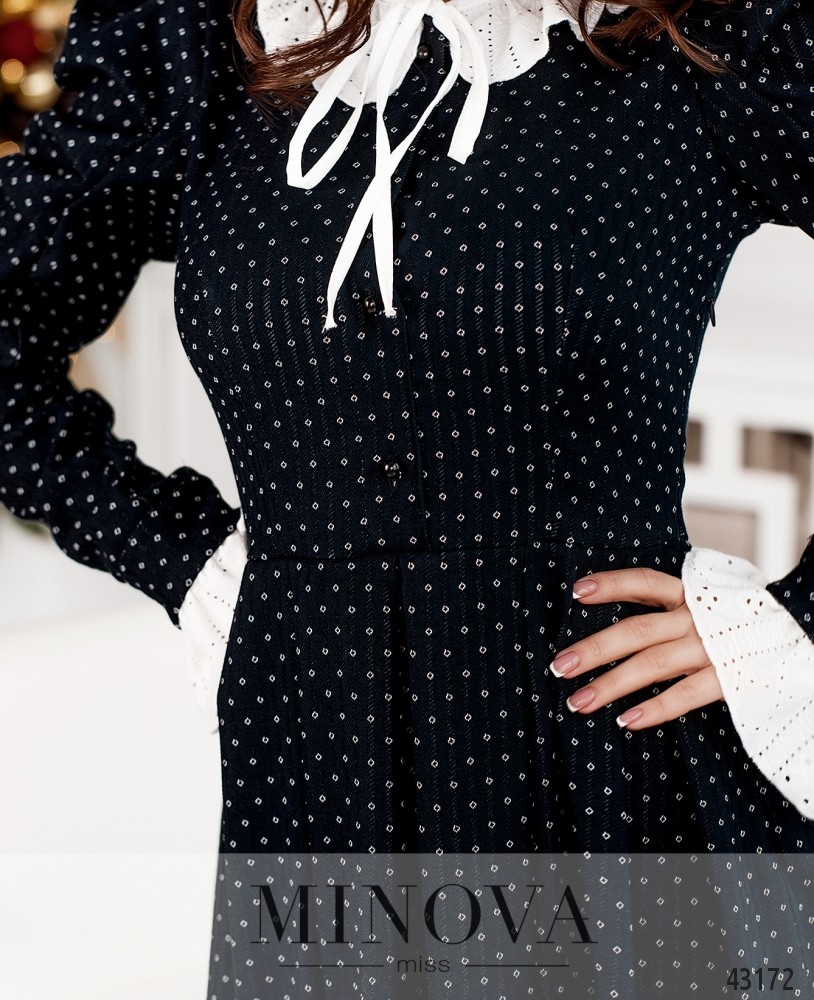 Нежное романтичное платье с оригинальным рукавом фасона жиго. На рукавах небольшие манжеты из кружева, с одной пуговкой, и такое же кружево - на накладном подшитом воротничке с лентами. Силуэт приталенный, юбка плиссирована. Карманов нет. На груди - декоративные пуговицы. Застёжка - змейка, вшитая слева.