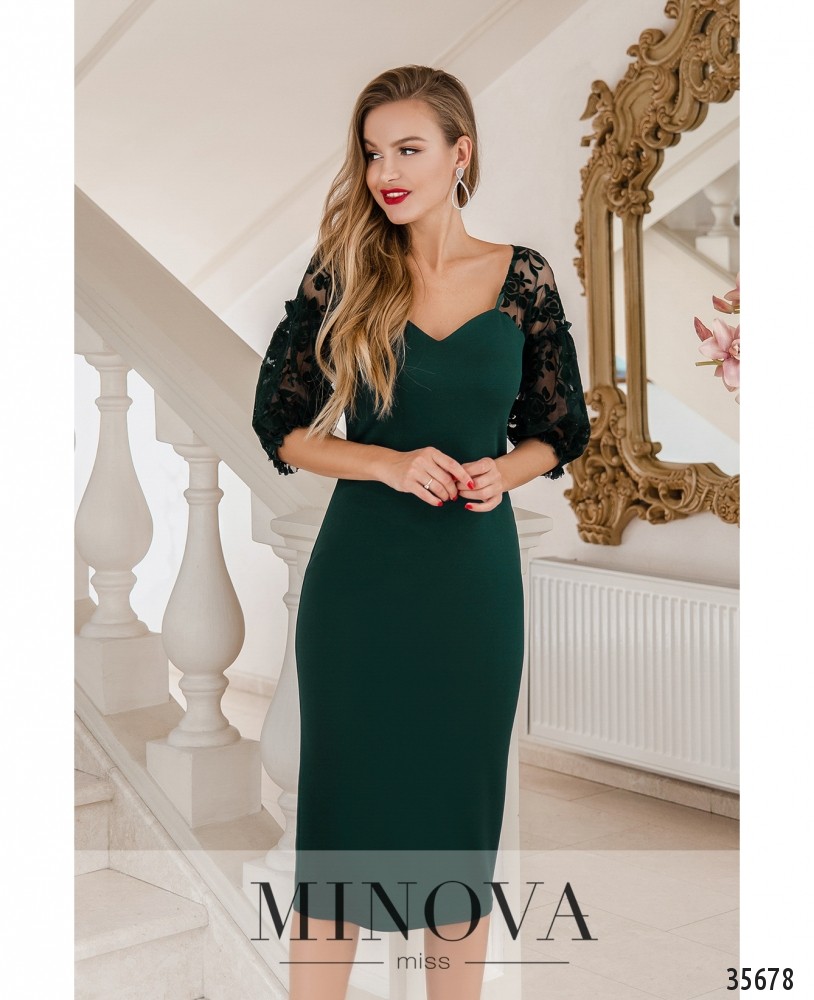 По-настоящему очаровательное и изящное платье из новой коллекции женской одежды от Minova покорит твоё сердце с первого взгляда! А потом будет покорять сердца окружающих на вечеринке или другом торжестве, на которое ты наденешь это платье. Платье приталенное, с вырезом «каре» из гладкой, лёгкой и мягкой ткани, а верх лифа и рукава – из ажурного цветочного гипюра. Рукава длиной ¾, фасона «фонарик». Карманов на платье нет, на груди – небольшие вытачки. Застёжка – вшитая молния слева подмышкой, до бедра. Платье длины миди, с ним очень хорошо сочетаются классические туфли-лодочки. Ты можешь добавить к этому свои любимые аксессуары, особенно если выберешь модель чёрного цвета. Впрочем, красная и тёмно-зелёная модели смотрятся не менее нарядно!