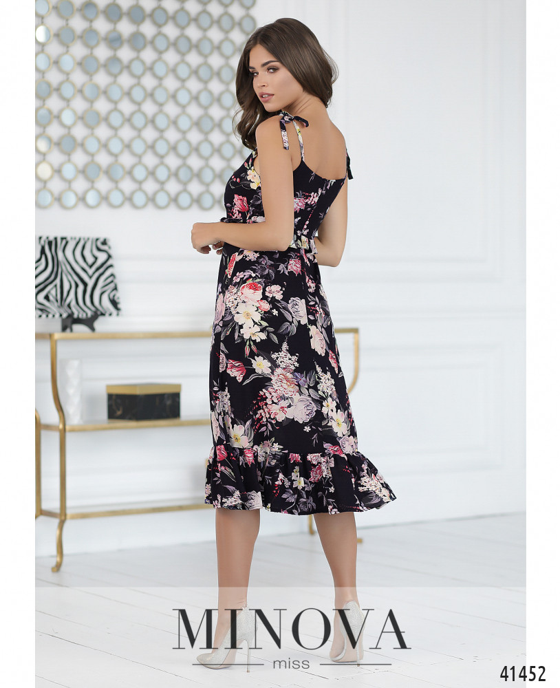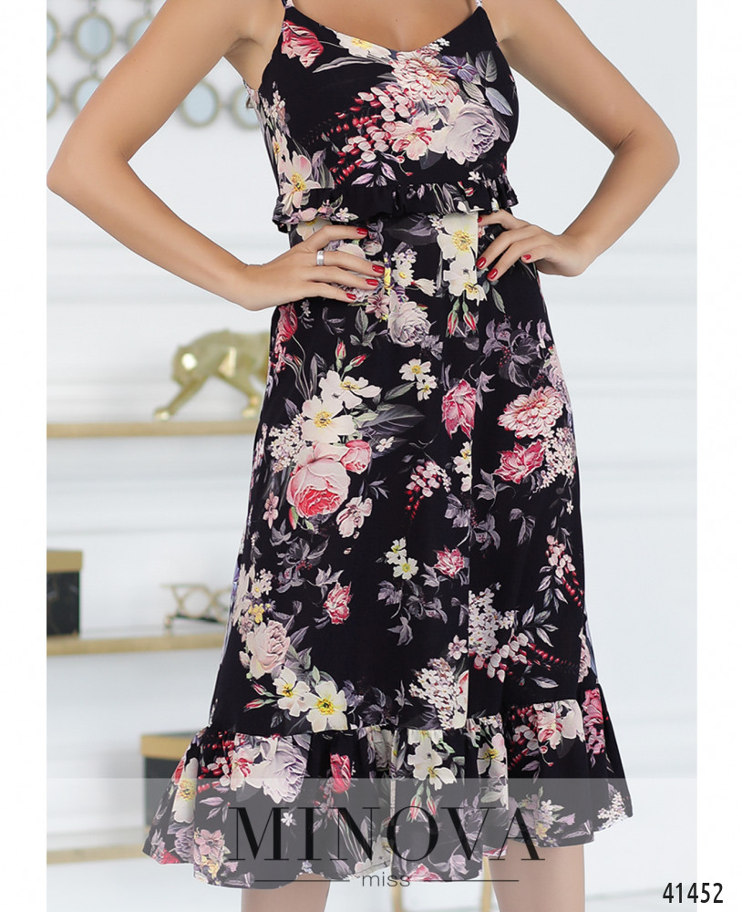 Элегантное и романтичное платье на тонких бретелях, с оборками на талии и на подоле. Застёгивается на молнию, вшитую по спинке. Карманов нет.