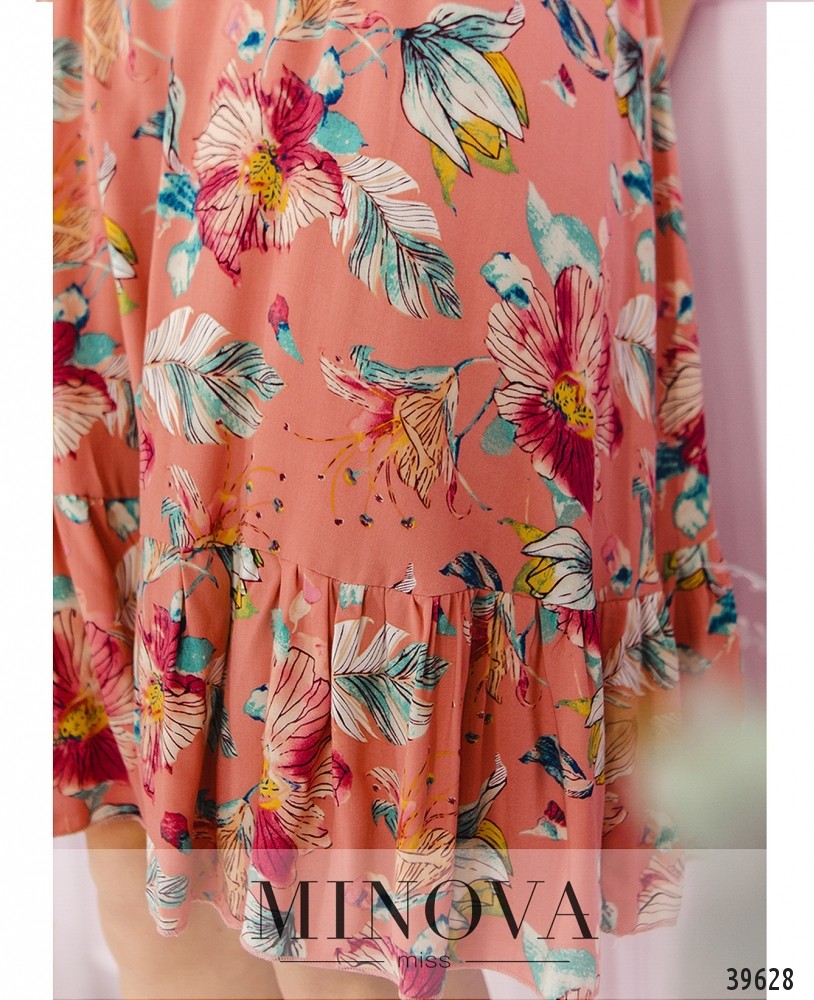 Стильное платье с цветочным принтом и завязками на V-образных вырезах спереди и по спинке. Рукава короткие, с манжетами, которые можно завязать на бант. Без застёжек и карманов. По низу подола подшиты оборки. Подол подшит к верху, в пояс вшита резинка.