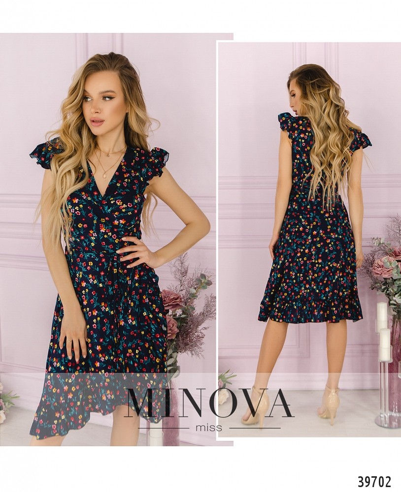 Лёгкое и яркое платье с крупным цветочным принтом, завязывается на запАх через прорезь на поясе сбоку, рукава - небольшие крылышки с оборками. Без карманов и застёжек.