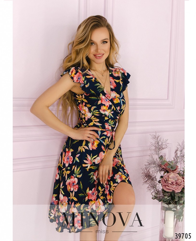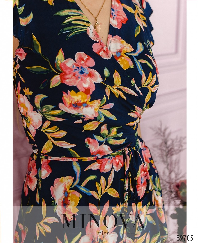 Лёгкое и яркое платье с крупным цветочным принтом, завязывается на запАх через прорезь на поясе сбоку, рукава - небольшие крылышки с оборками. Без карманов и застёжек.