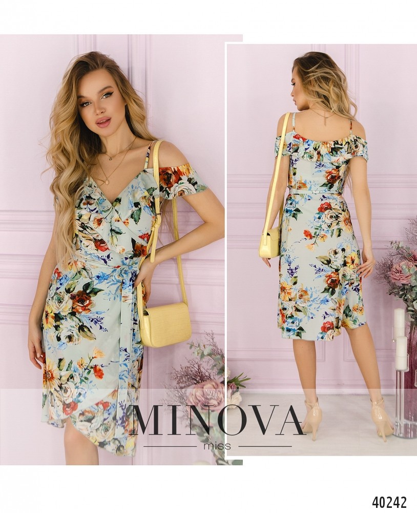 Нежное и очаровательное платье с тонкими лямками и кружевными рукавами с открытыми плечами. Застёжек и карманов нет, завязывается на запАх с помощью пояска, который продевается в прорезь сбоку на поясе.