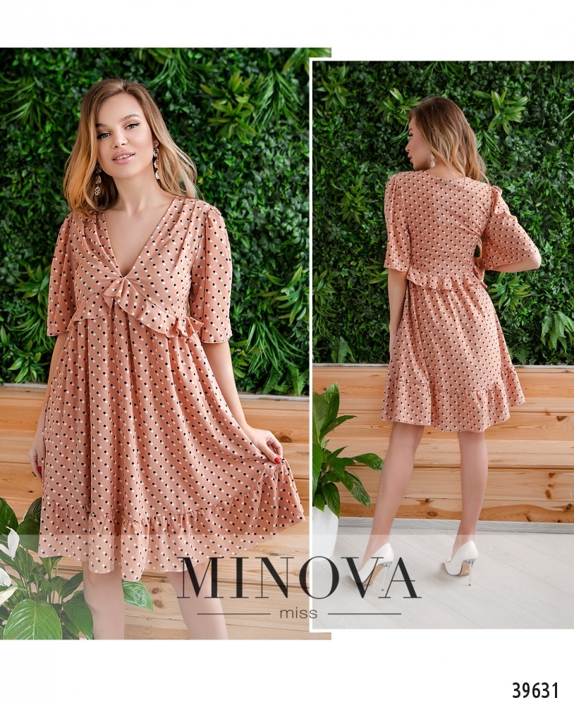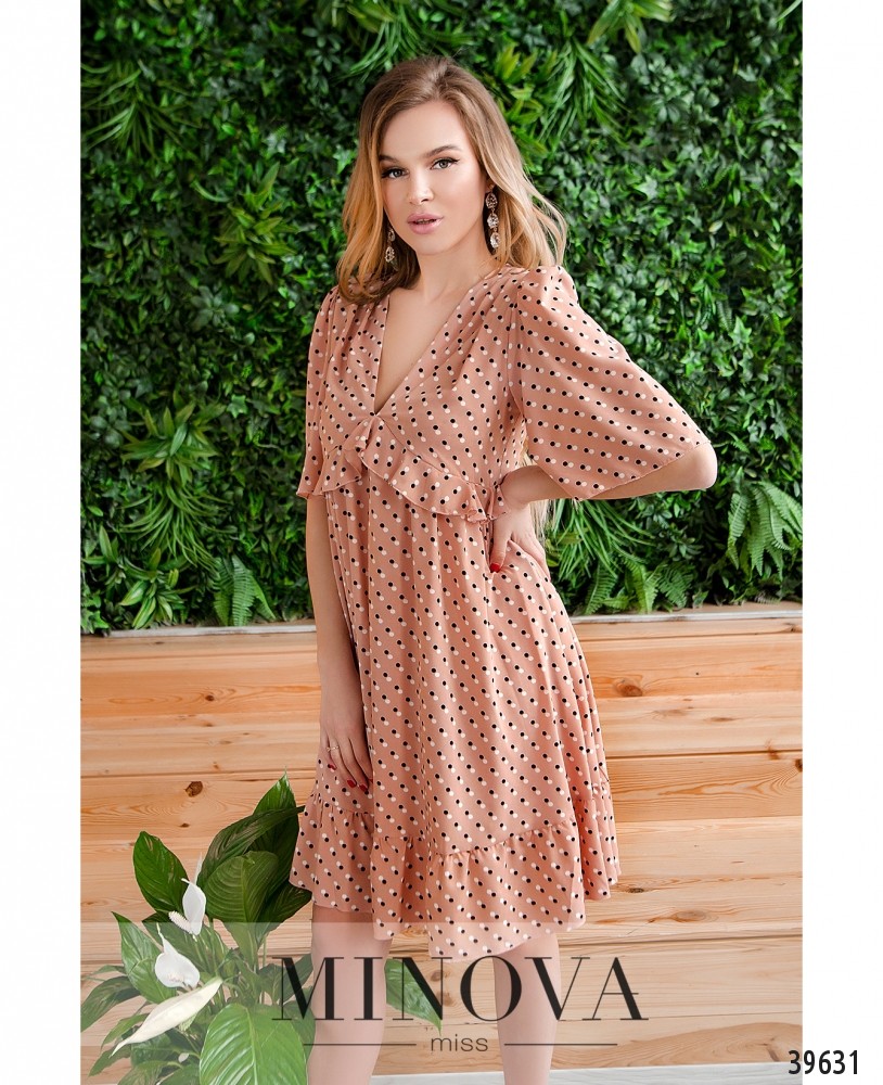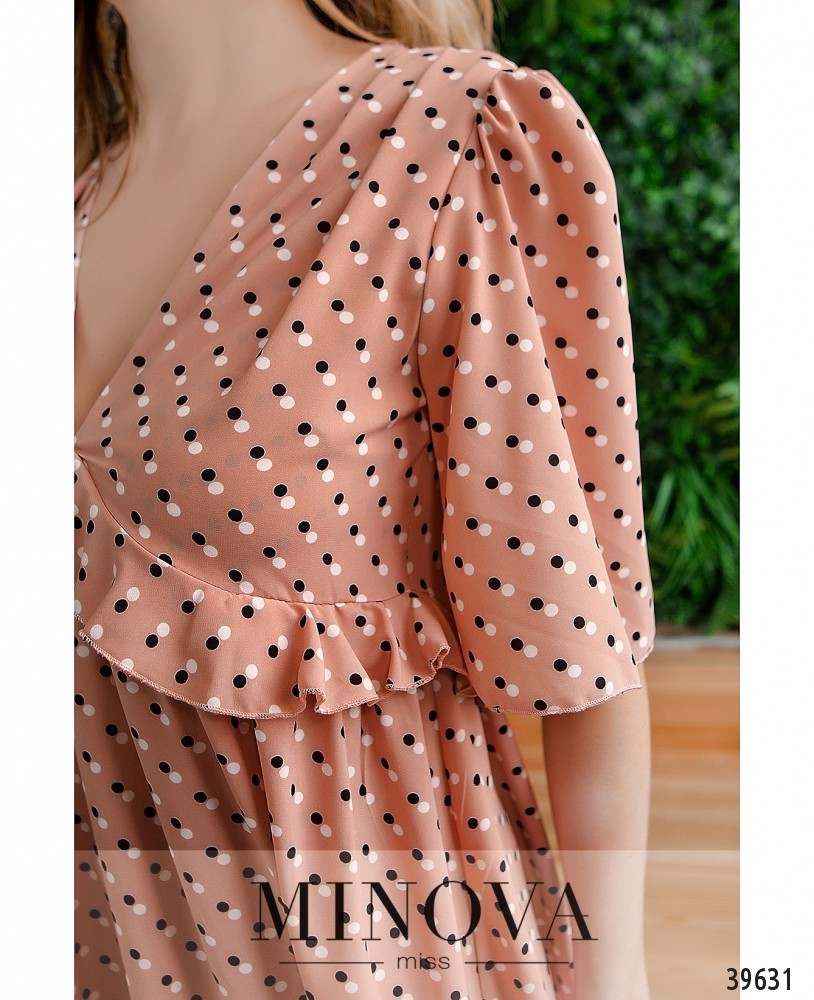 Милое платье в горошек с оборками на талии и глубоким V-образным декольте. Рукава-крылышки, без манжет. К подолу подшиты оборки, подол расклешённый. Карманов и застёжек нет.