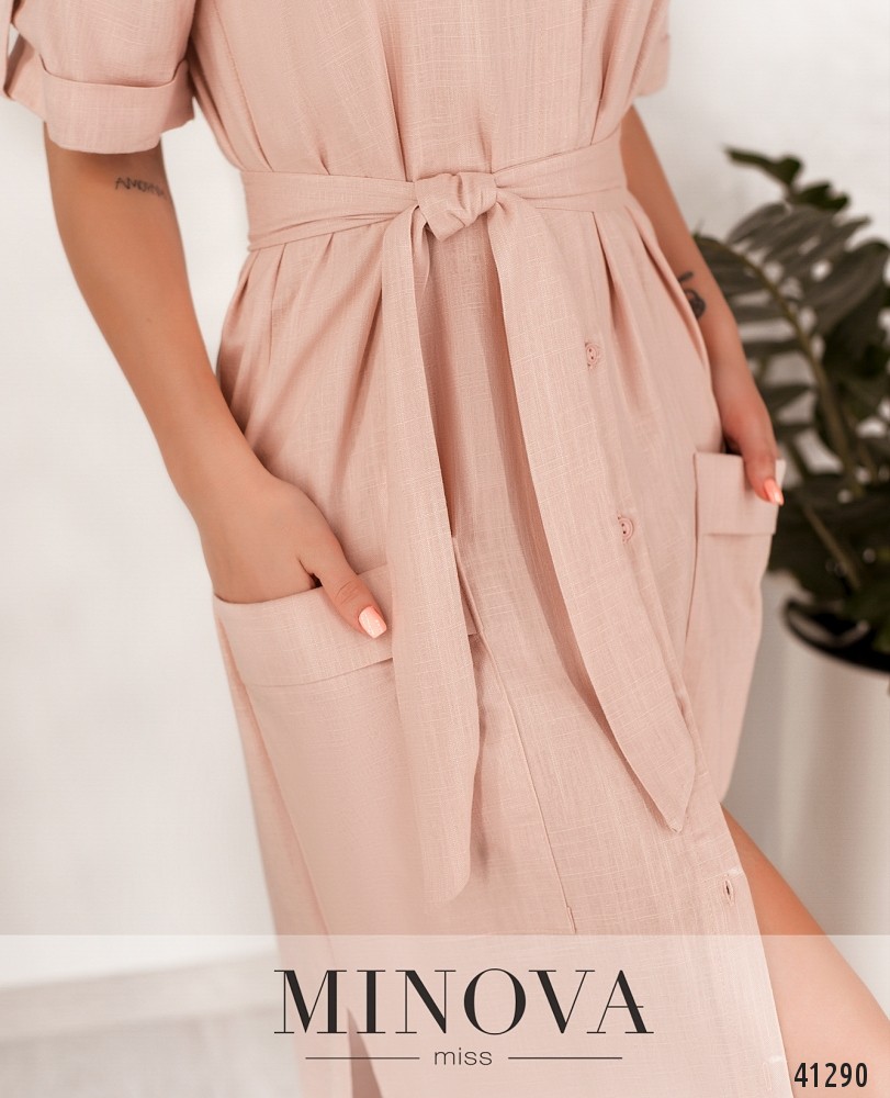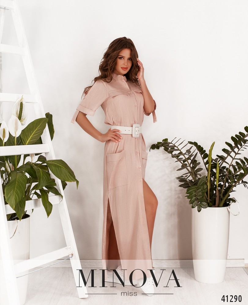 Удобное повседневное платье с декоративными клапанами на груди, на бёдрах спереди - накладные карманы. Застёгивается на ряд пуговиц спереди на планке, до подола. На подоле по бокам - разрезы. Воротник - небольшая стоечка. Рукава с регулировочной лентой и пуговицей, а также с разрезами сбоку. В комплекте - пояс.