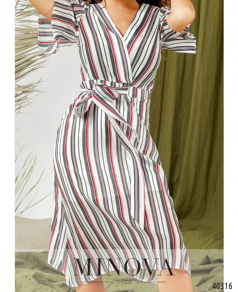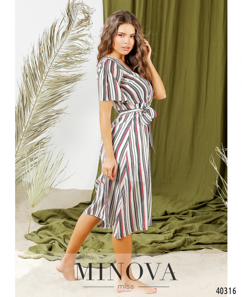 Стильное платье с неглубоким V-образным вырезом, подшитым на запАх. Подол подшит к верху, на талии подшит длинный пояс, который охватывает талию. Карманов нет. Застёгивается на змейку, вшитую по спинке. Рукава расклешённые, короткие. На груди вытачки.