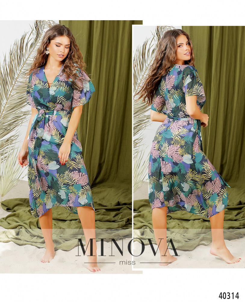 Стильное платье с неглубоким V-образным вырезом, подшитым на запАх. Подол подшит к верху, на талии подшит длинный пояс, который охватывает талию. Карманов нет. Застёгивается на змейку, вшитую по спинке. Рукава расклешённые, короткие. На груди вытачки.