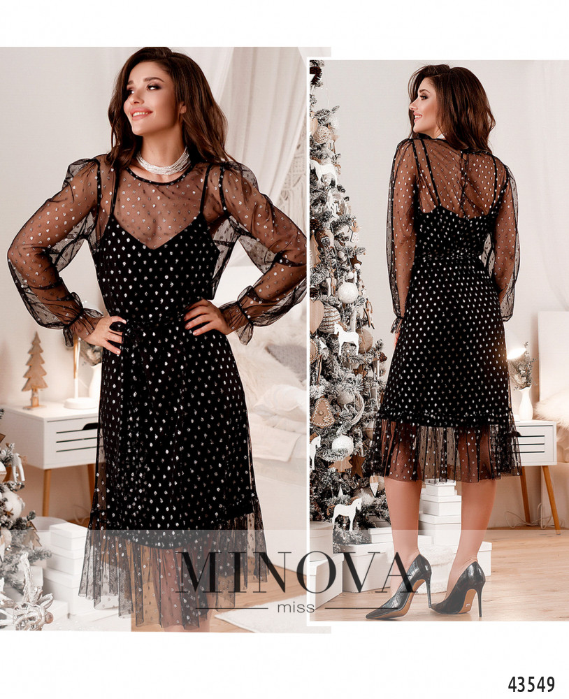 Стильное двойное платье, нижняя часть напоминает майку с тонкими лямками, без застёжек и карманов. На груди вытачки. Верхняя накидка полупрозрачная, с блёстками, без карманов, застёжка - пуговка сзади под шеей. Снизу украшена оборками. Рукава с оборками и резинкой на манжетах.