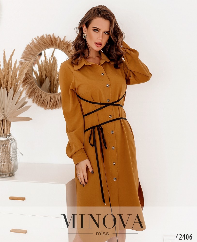 Элегантное повседневное платье с длинной лентой, украшенной набалдашниками на кончиках. Платье с отложным воротничком и рядом пуговиц спереди на планке, до низу подола. Рукава с манжетами, на манжетах по одной пуговке. По бокам подола - разрезы. В наличии врезные карманы.