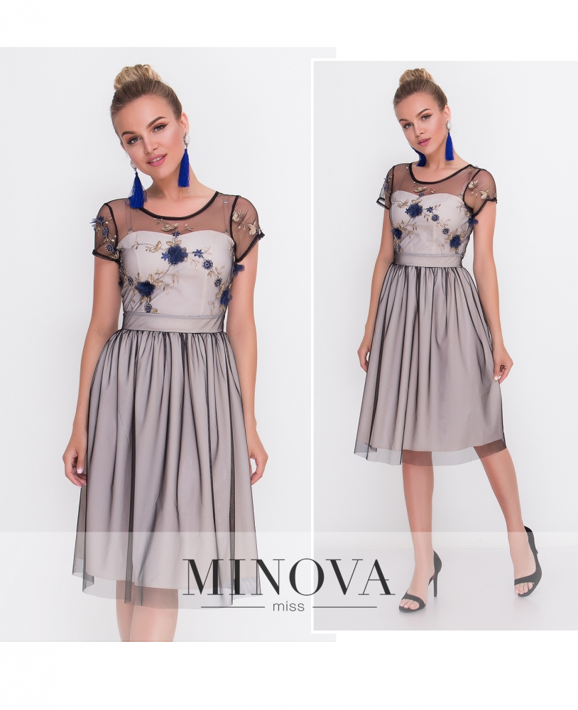 Женственное двухслойное платье из черной сетки и нижнего светлого слоя с короткими рукавами, расшитым цветами лифом, и отрезным пышным подолом. На спинке платье застегивается на скрытую молнию.
