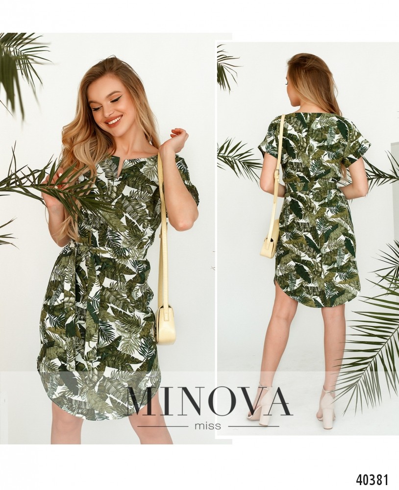 Яркое платье без застёжек и карманов, с поясом, рукава с отворотами, вырез горловины неглубокий, V-образный.