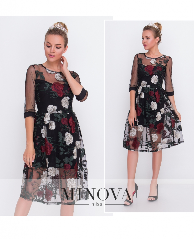 Очаровательное платье из комбинации и сетки, расшитой крупными розами. Длина рукава ¾. Пышный отрезной подол. На спинке платье застегивается на молнию.