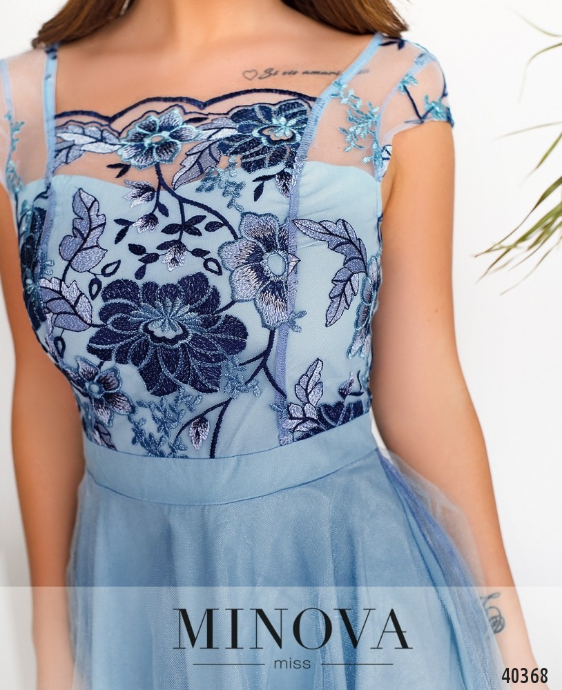 Женственное и очень нарядное платье с шифоновым верхом на подоле, нижняя ткань мягкая, приятная к телу. Верх декорирован качественной привлекательной вышивкой. Платье без рукавов, без карманов, застёгивается на молнию, вшитую по спинке, силуэт приталенный. Вырез декольте фигурный.