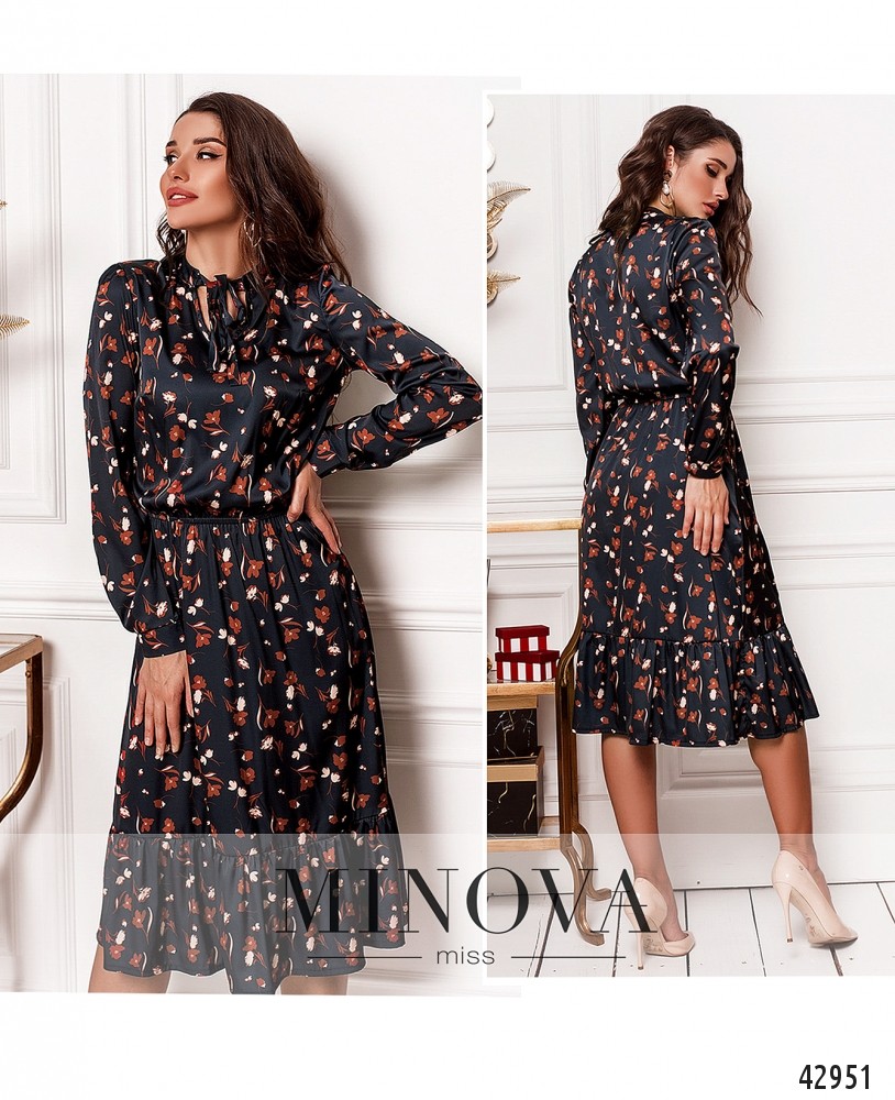 Романтичное платье с завязками на горловине, рукава с манжетами, на манжетах по одной пуговице. Подол с оборками. В пояс вшита резинка, карманов нет.