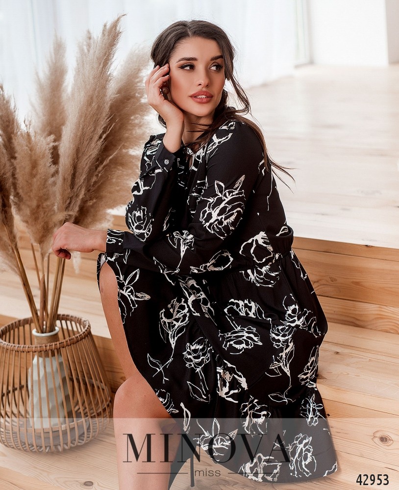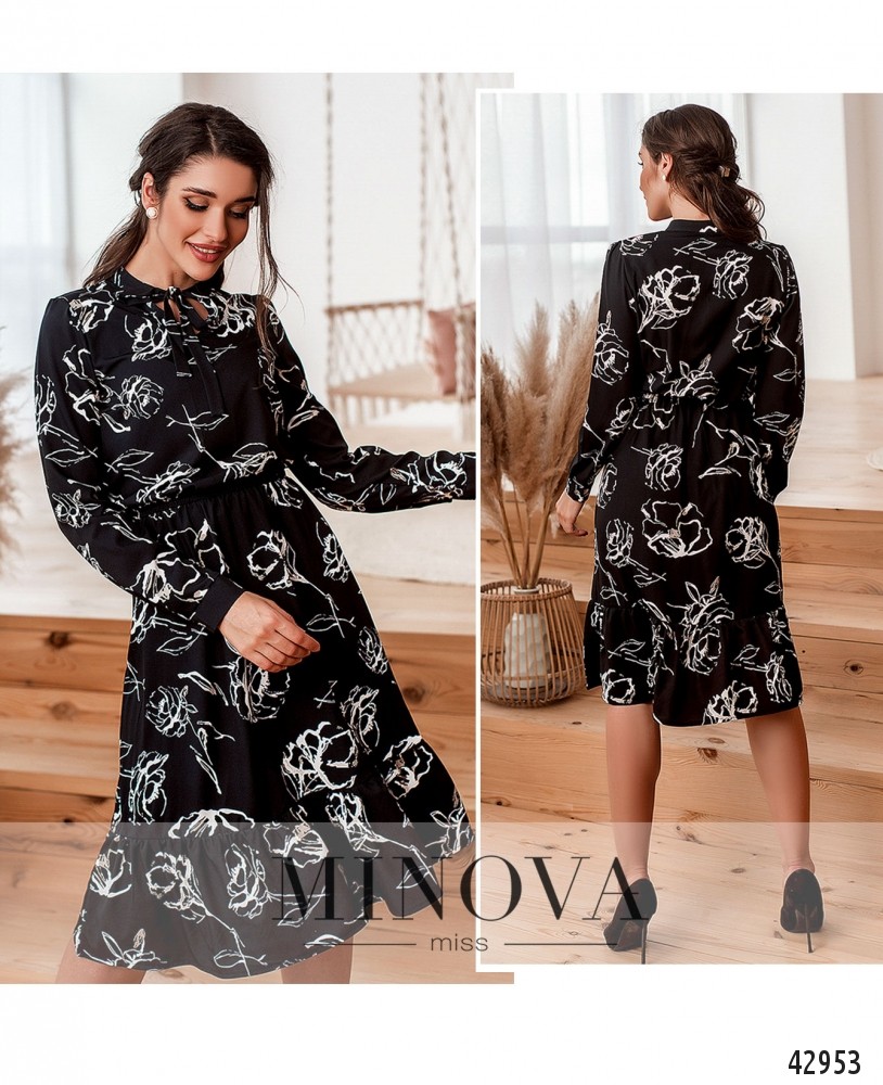 Романтичное платье с завязками на горловине, рукава с манжетами, на манжетах по одной пуговице. Подол с оборками. В пояс вшита резинка, карманов нет.