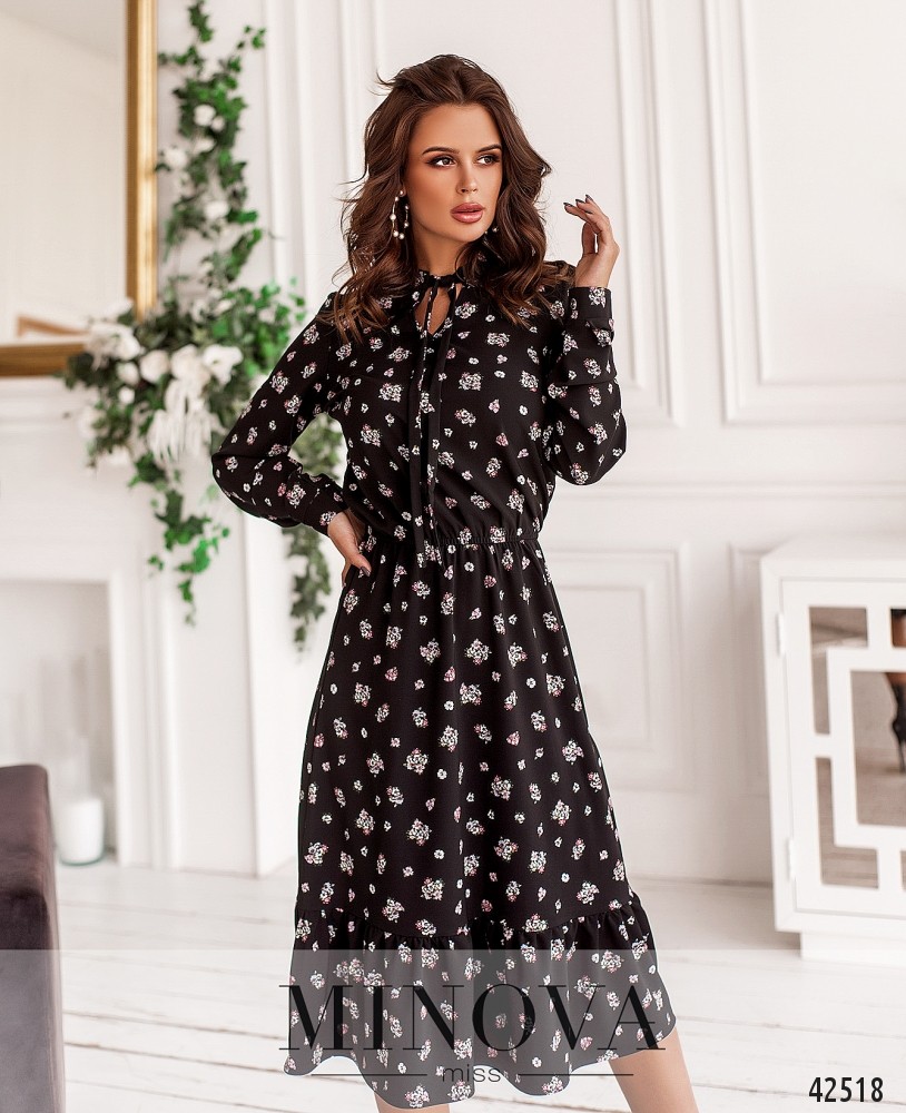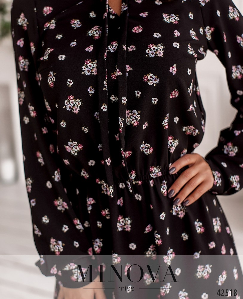 Женственное платье с цветочным принтом. Застёжек и карманов нет, на подоле - оборки, на шее спереди - завязки. Рукава с манжетами, на манжетах по одной пуговице. Подол подшит к верху и расклешён.