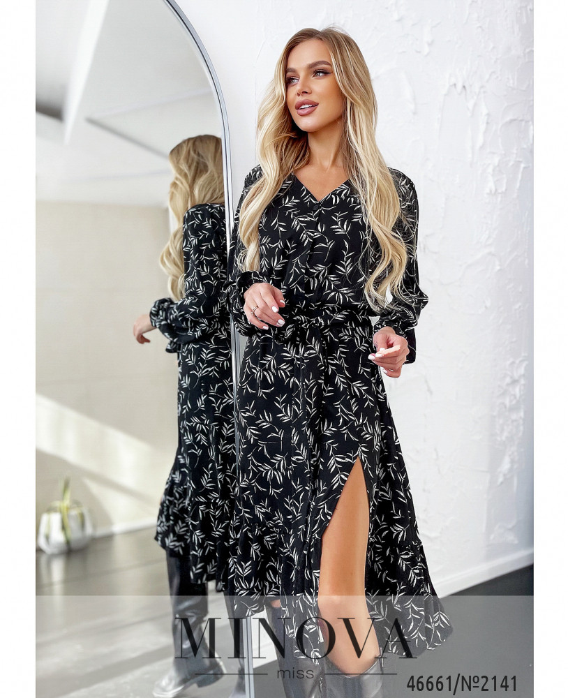 Нежное и романтичное платье с V-образным вырезом горловины и соблазнительным разрезом на подоле позволит выглядеть роскошно даже в повседневных образах. Модель дополнена длинными рукавами с оборками на резинках вместо манжет и застежкой на пуговицах от горловины до талии, расположенной спереди. По линии талии также вшита резинка.