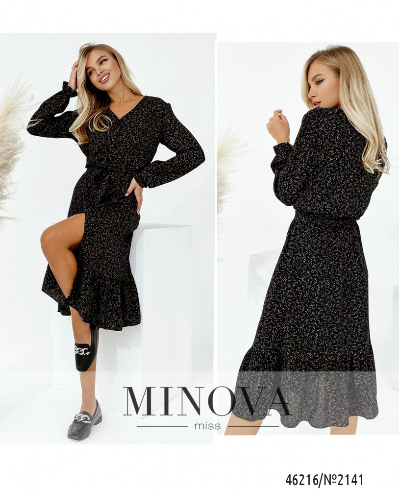 Нежное и романтичное платье с V-образным вырезом горловины и соблазнительным разрезом на подоле позволит выглядеть роскошно даже в повседневных образах. Модель дополнена длинными рукавами с оборками на резинках вместо манжет и застежкой на пуговицах от горловины до талии, расположенной спереди. По линии талии также вшита резинка.