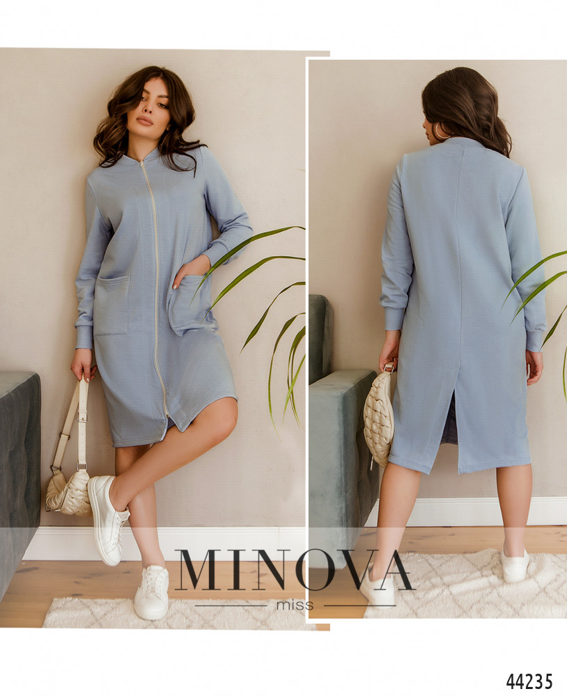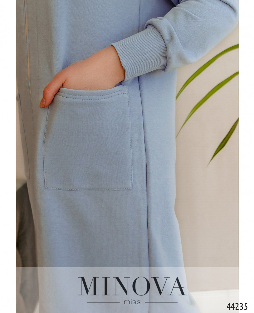 Комфортное платье с мягким манжетом на горловине и на рукавах, спереди накладные карманы, застёгивается на сквозную змейку спереди по центру, сзади на подоле шлица. Без подкладки.
