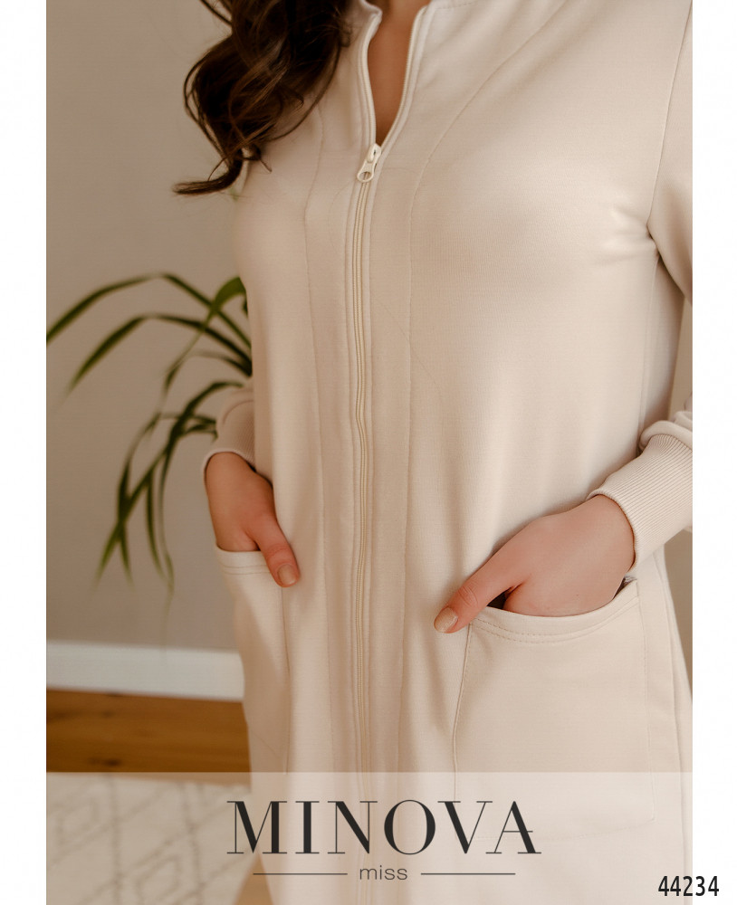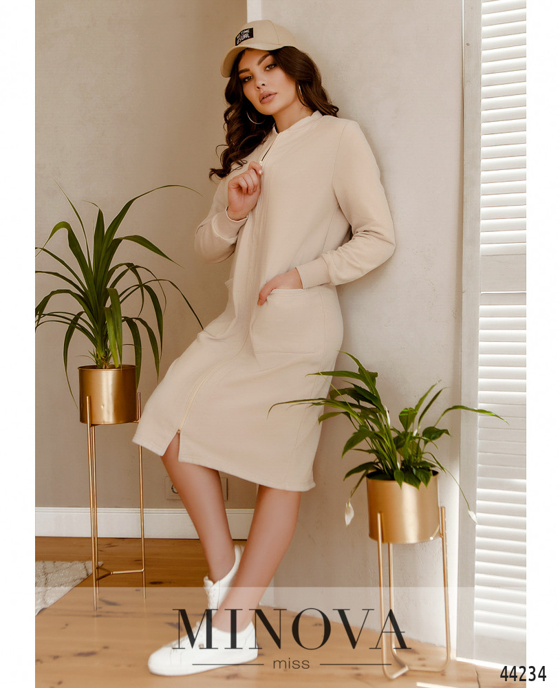 Комфортное платье с мягким манжетом на горловине и на рукавах, спереди накладные карманы, застёгивается на сквозную змейку спереди по центру, сзади на подоле шлица. Без подкладки.