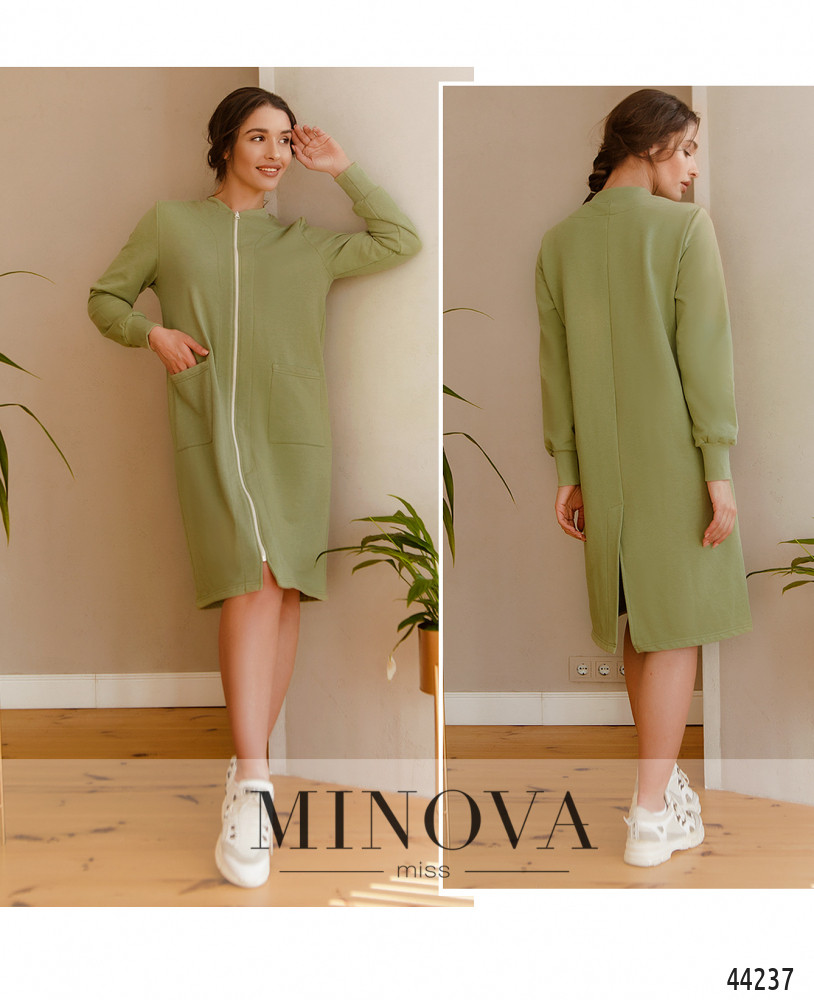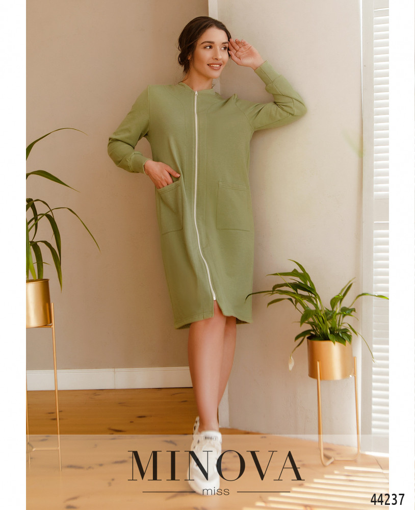 Комфортное платье с мягким манжетом на горловине и на рукавах, спереди накладные карманы, застёгивается на сквозную змейку спереди по центру, сзади на подоле шлица. Без подкладки.
