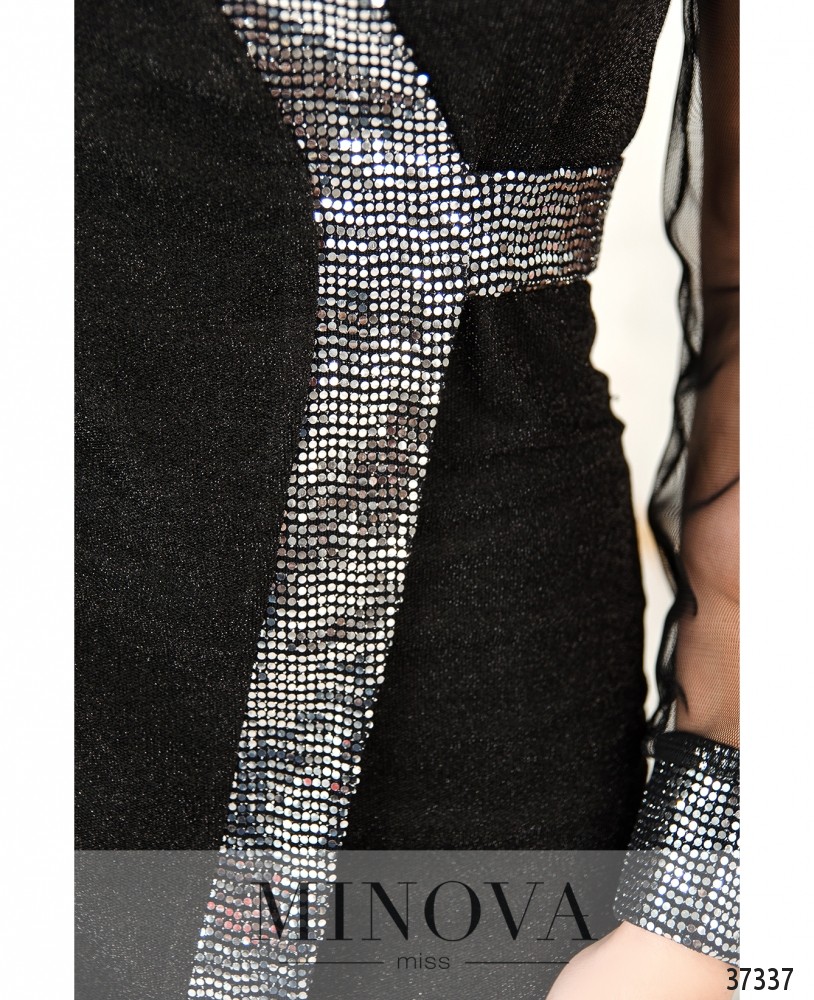 Праздничное вечернее платье приталенного силуэта из мягкой ткани с люрексом. Подшито на запАх и оторочено контрастной лентой с пайетками. Рукава из полупрозрачной сеточки, манжеты плотные, украшены пайетками. Застёжка – вшитая по спине змейка. Карманов нет. На спине продольные вытачки.