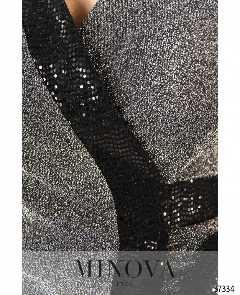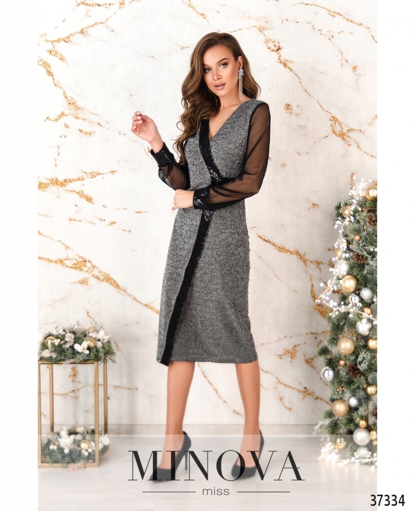 Праздничное вечернее платье приталенного силуэта из мягкой ткани с люрексом. Подшито на запАх и оторочено контрастной лентой с пайетками. Рукава из полупрозрачной сеточки, манжеты плотные, украшены пайетками. Застёжка – вшитая по спине змейка. Карманов нет. На спине продольные вытачки.