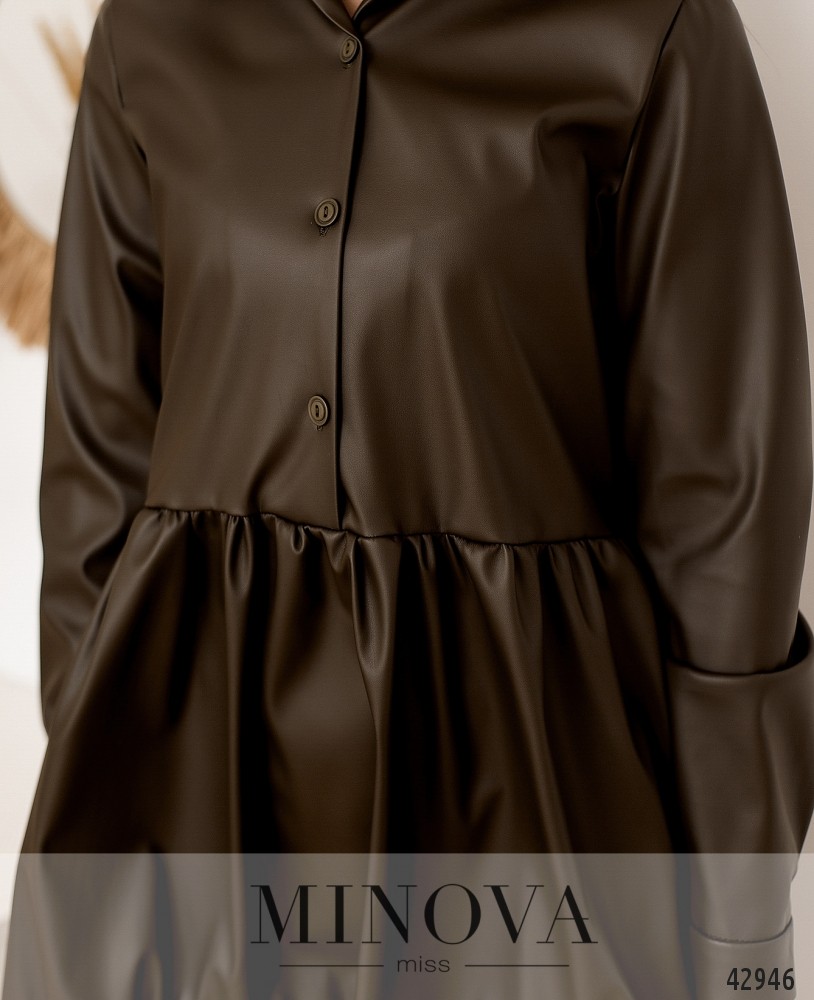 Оригинальное платье с расклешённым подолом, украшенным оборками. Воротничок отложной, застёгивается на ряд пуговиц спереди на планке до талии. Рукава с манжетами, на манжетах по одной пуговице. По бокам - врезные карманы. Ткань изнутри гладкая.