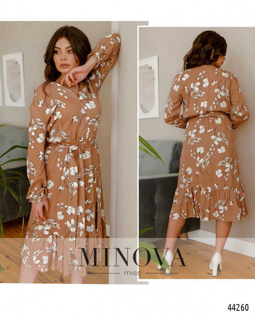 Элегантное платье с V-образным вырезом горловины, застёгивается на ряд пуговиц с петельками по вырезу декольте. В комплекте пояс в тон. В талию вшита резинка. Рукава с мягкими манжетами без пуговиц, карманов нет. Подол украшен оборками, чуть сбоку - длинный разрез.
