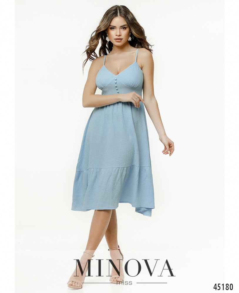 Невесомое летнее платье миди на тонких регулируемых бретелях практически не ощущается на теле. Открытый приталенный лиф, декорированный пуговицами в тон, плавно переходит в воздушный расклешенный подол, дополненный воланом. Такой фасон позволит вам выглядеть эффектно и комфортно даже в самые жаркие дни.