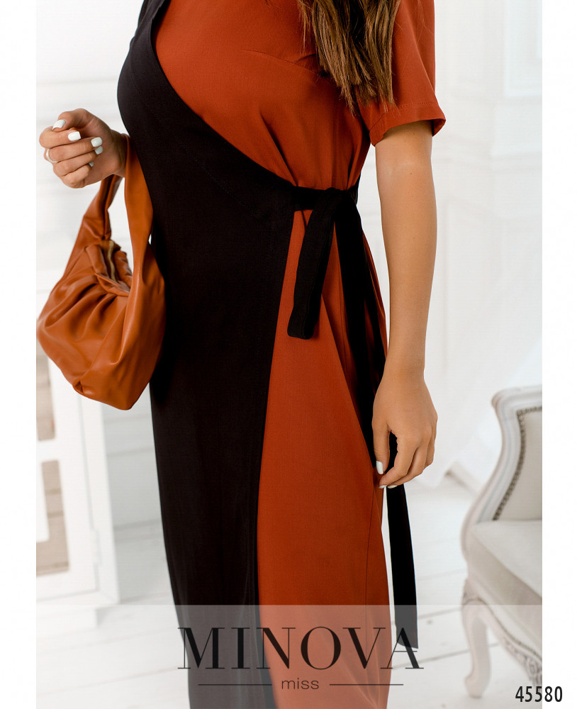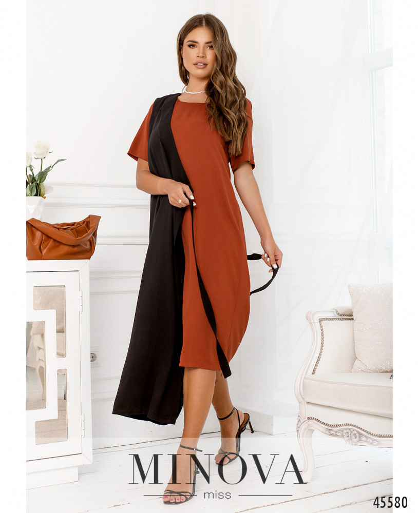 Если вам нравится самовыражаться через свой стиль и вы любите одежду необычного неожиданного кроя, то обратите внимание на эту модель. Элегантное минималистичное платье миди с короткими рукавами и полукруглым вырезом горловины в комплекте с удлиненной контрастной накидкой на одно плечо, завязывающейся сбоку на талии,