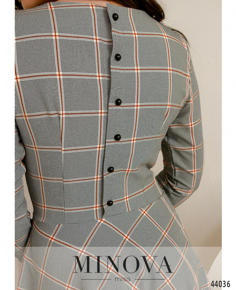 Нежное платье с отрезным расклешённым подолом, вырез горловины полукруглый. Сзади по спинке, от горловины до талии - ряд декоративных пуговиц. Рабочая застёжка - молния по левой сторонке. По бокам - карманы в шве, на груди вытачки, рукава с небольшими мягкими манжетами.