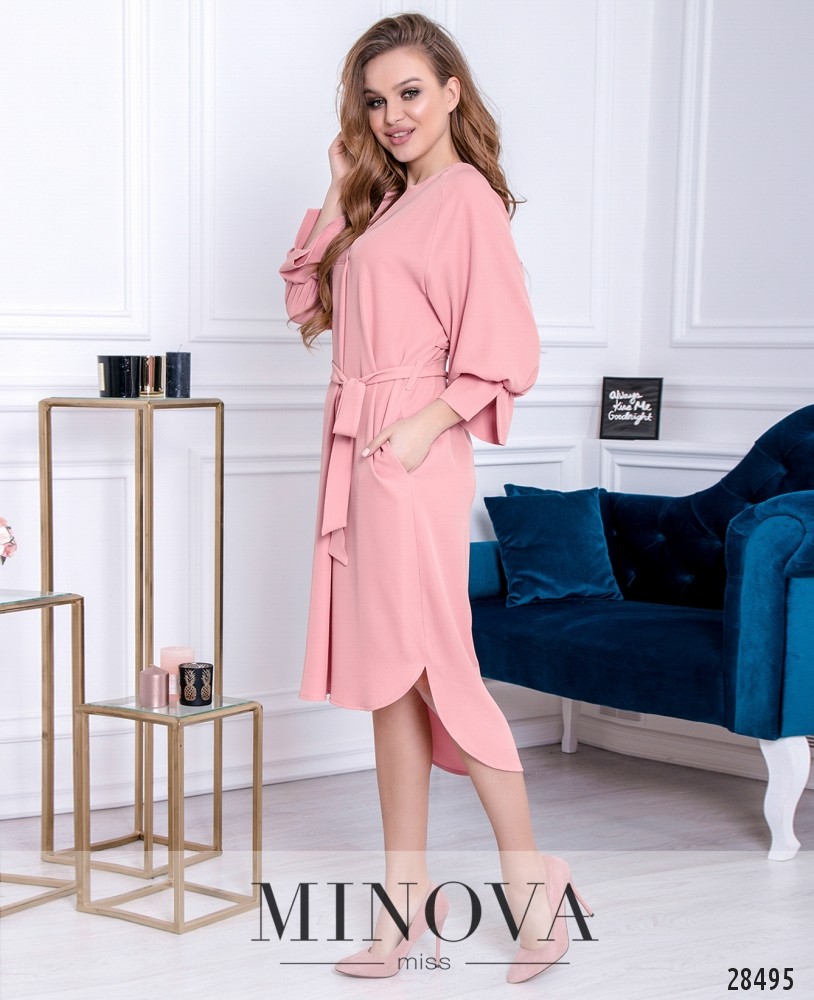Свободное и легкое платье с V-образным вырезом и удлиненной спинкой. Платье со спущенными рукавами длины ¾, дополнены сборкой на резинке. Что бы акцентировать элегантную талию, есть поясок на шлейках, по бокам есть карманы. По спинке дополнительная тканевая вставка, чтобы придать платью фактуры. Изделие без дополнительных застежек. Платье можно сделать более повседневным добавив сумку-бананку в место пояса и одев обувь на низком ходу.