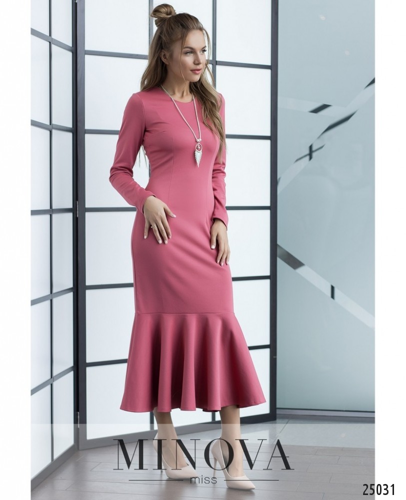 Очень женственное макси-платье с отрезным подолом из рюшей а-ля «хвост русалки». Платье по фигуре с длинными рукавами, на спинке застегивается на скрытую молнию. Образ дополняет подвеска, которая входит в комплект.