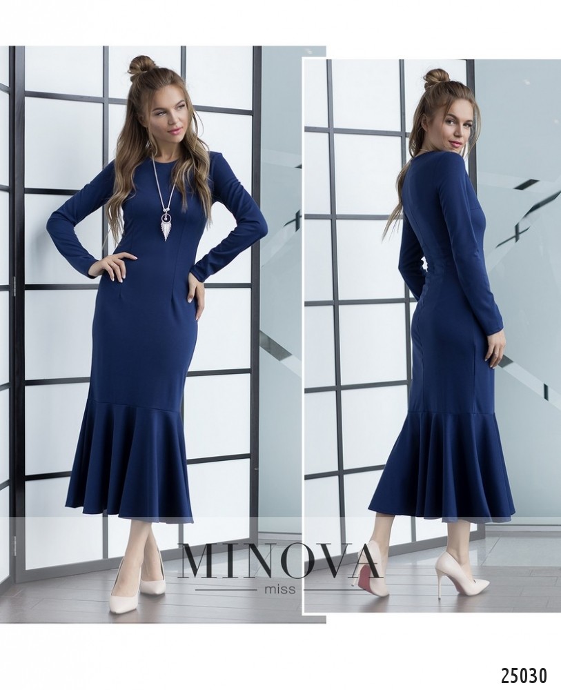Очень женственное макси-платье с отрезным подолом из рюшей а-ля «хвост русалки». Платье по фигуре с длинными рукавами, на спинке застегивается на скрытую молнию. Образ дополняет подвеска, которая входит в комплект.